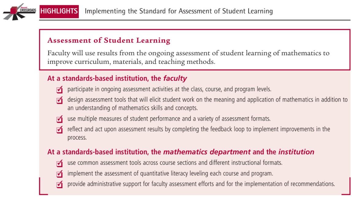 Good assessment practices lead to faculty reflection and action to improve student learning in mathematics. Assessment must occur at the class, course, and program levels of instruction and across different instructional and delivery models. All assessment efforts must be linked to student learning outcomes and assessment tools must be designed to measure what faculty believe is important for students to learn. When analyzing data, unfavorable results should be considered, as well as favorable results. Realizing a problem exists (that students are not achieving an outcome) is the first step in motivating faculty to consider changes. The most important result of assessment efforts is the discussion and introspection among mathematics faculty about what is really important for students to learn and how best to help them learn it.