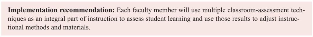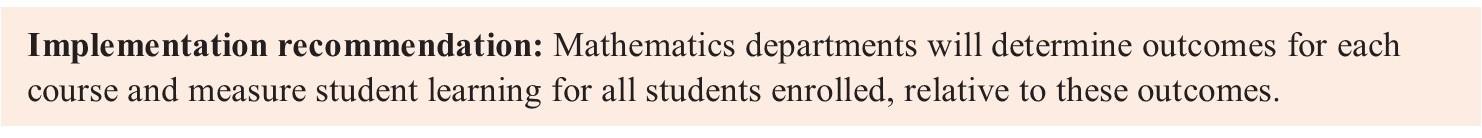 If students as a group are not achieving the desired course outcomes, faculty should respond in one or more ways to implement the agreed upon changes and begin the cycle again. This may include reexamining course content or prerequisites or assessment tools, altering teaching methods or activities, changing the type and frequency of testing, adjusting the percentage of group work or lecture, or modifying the amount of feed- back or individual attention given to students. Course assessment provides a systematic process to enact these improvements and a structure that encourages faculty to reflect upon and discuss what best helps students learn mathematics course content.