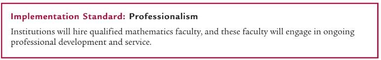 Professionalism with its core values of expertise, autonomy, commitment, and responsibility1 is at the heart of improving student success in mathematics. All two-year college mathematics faculty need to possess a strong academic preparation, participate in supportive professional development, exhibit the capacity for change and improvement, and shoulder the responsibility of carrying out multifaceted professional activities. Growing in knowledge of both mathematical content and pedagogical strategies, providing quality instruction, and exhibiting professional excellence are the results of deliberate faculty action.
