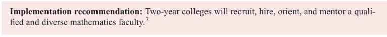One of the most important activities of a mathematics department is determining criteria for hiring new faculty. When choosing the best-qualified person for a vacancy, mathematics departments in two-year colleges should expect all candidates (full-time and adjunct) to have achieved the following: