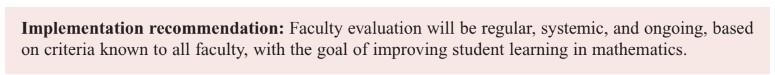 Teaching should be connected to the disciplinary and professional communities in which faculty pursue scholarly work.14 A key feature of the scholarship of teaching is the commitment of faculty to make their practices public, documenting their pedagogical work, and putting it forward for review. Teaching should be viewed as a process of ongoing reflection and inquiry that requires collegial exchange and openness.15 Mathematics faculty should be proactive in comparing results of the assessment of their students’ learning outcomes with those of similar classes in the department. Strategies to communicate the findings from the scholarship of teaching include the use of the following resources: